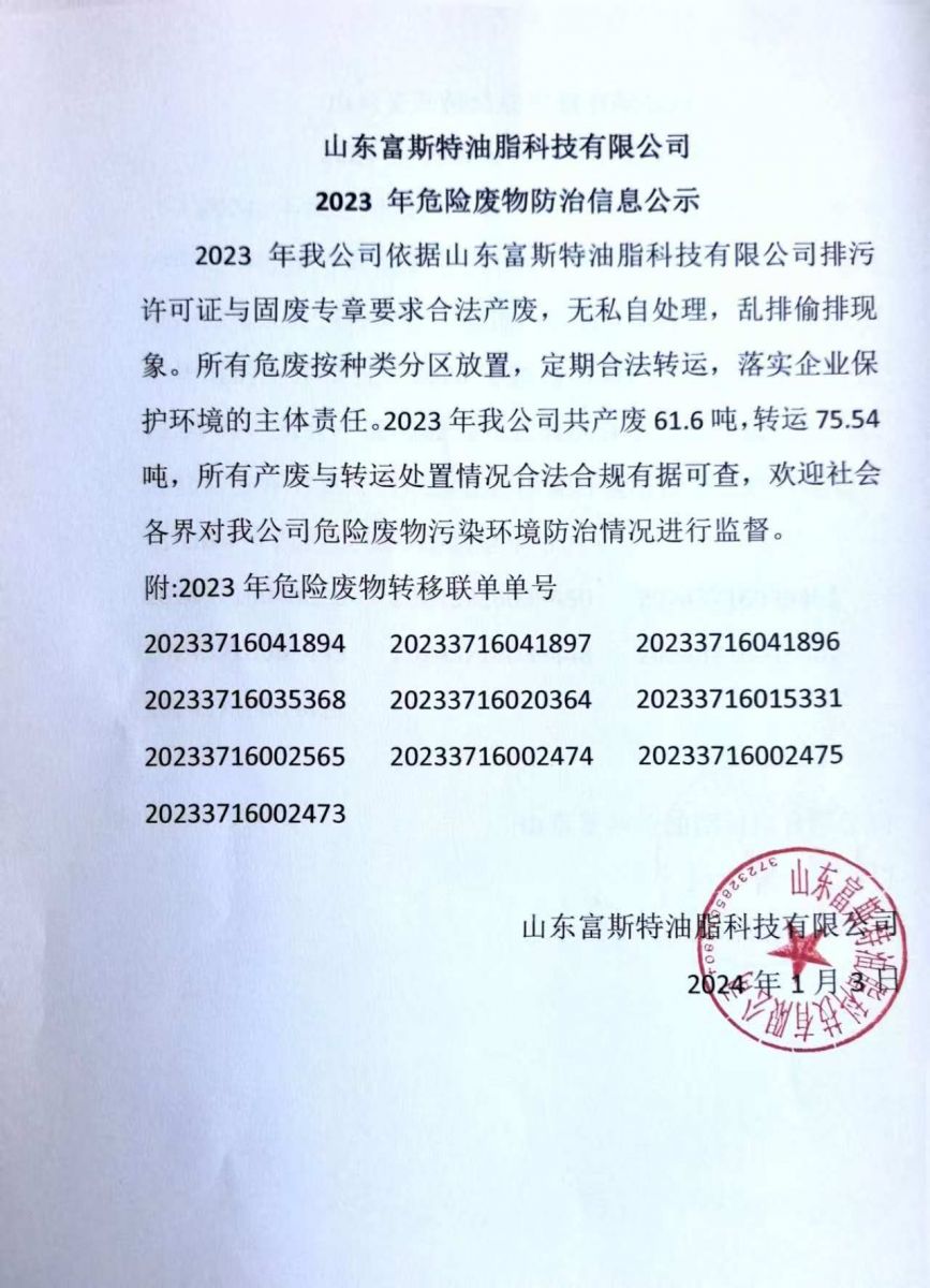 山东富斯特油脂科技有限公司2023年危险废物防治信息公示